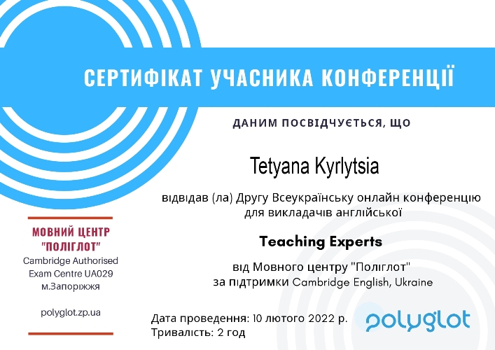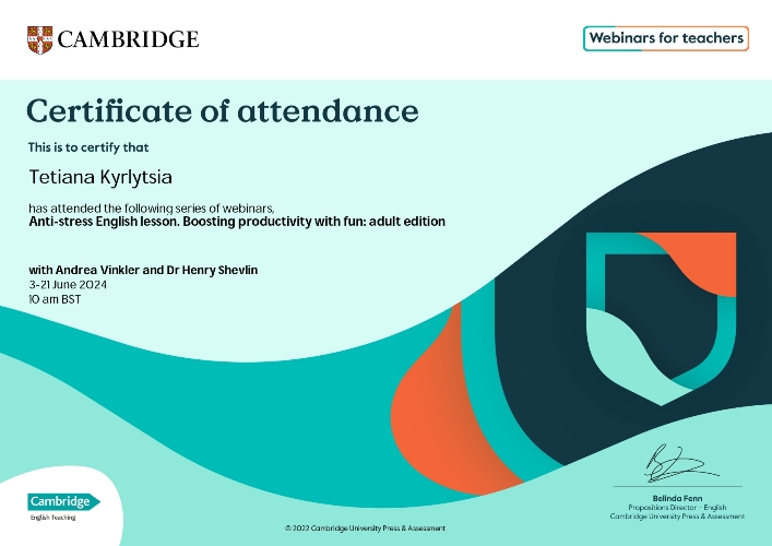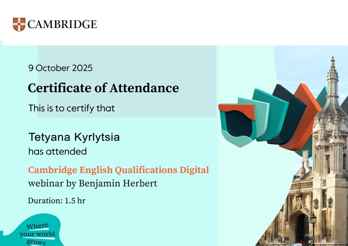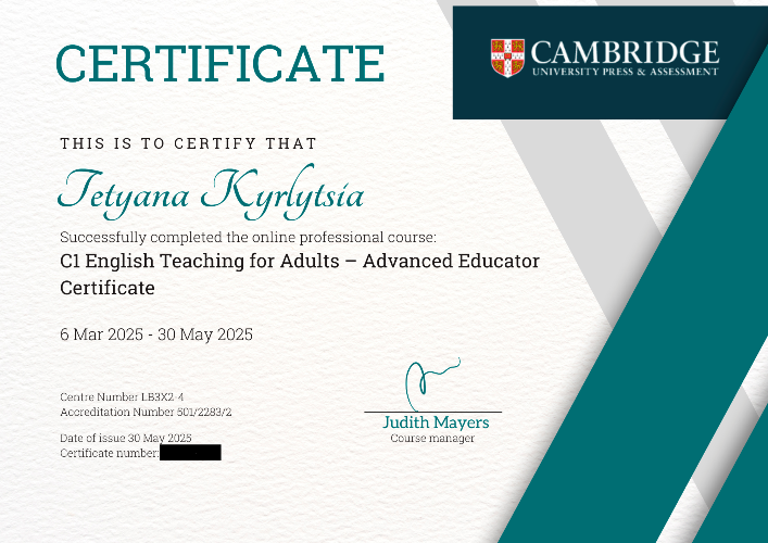 Я завжди орієнтуюся на цілі та побажання кожного студента, адже для мене головне — щоб англійська стала невід’ємною частиною вашої особистості та відкрила нові можливості у навчанні, кар’єрі й житті.