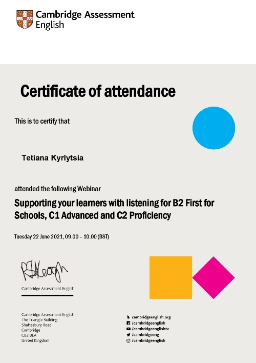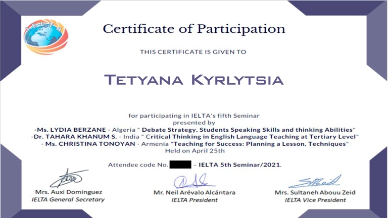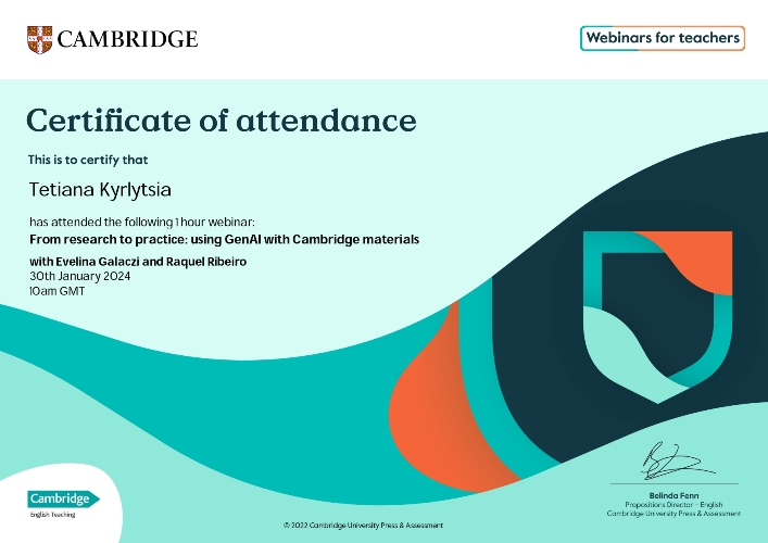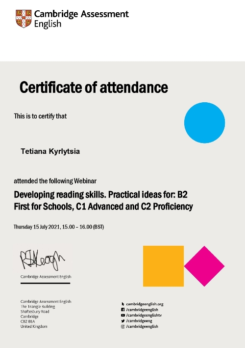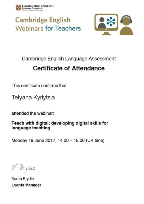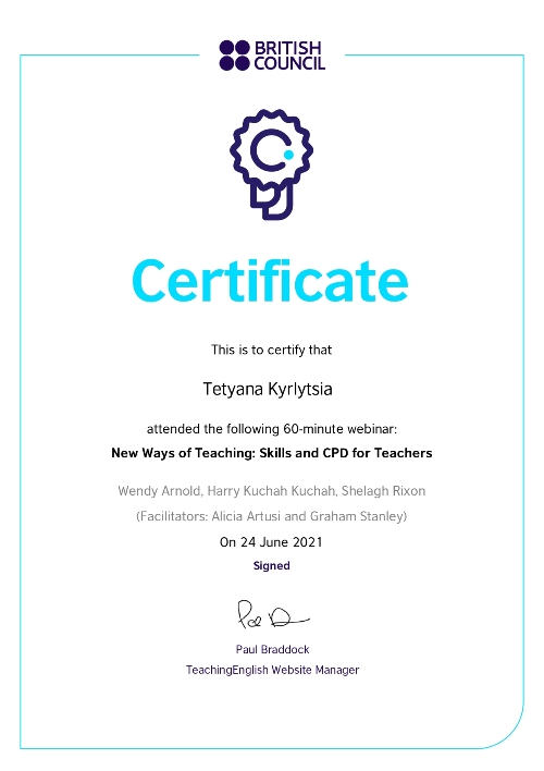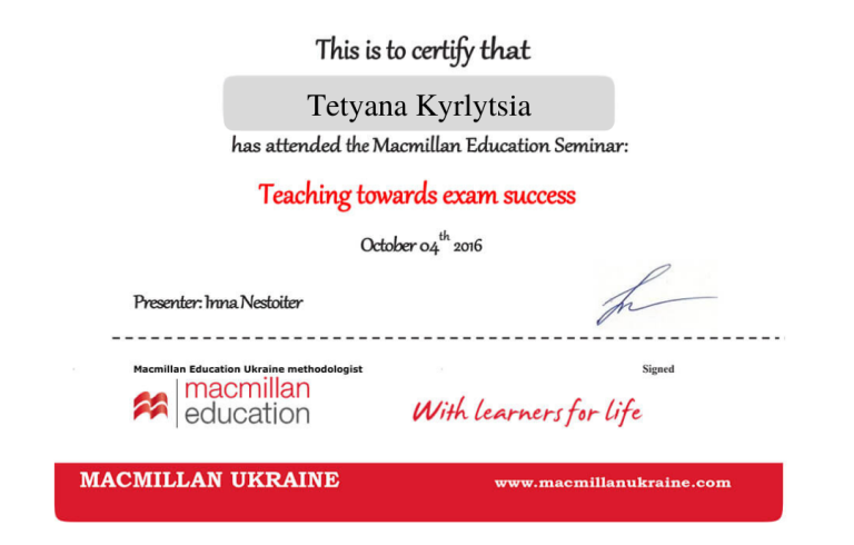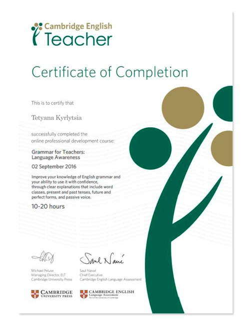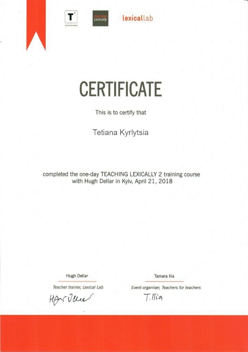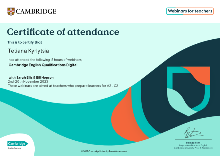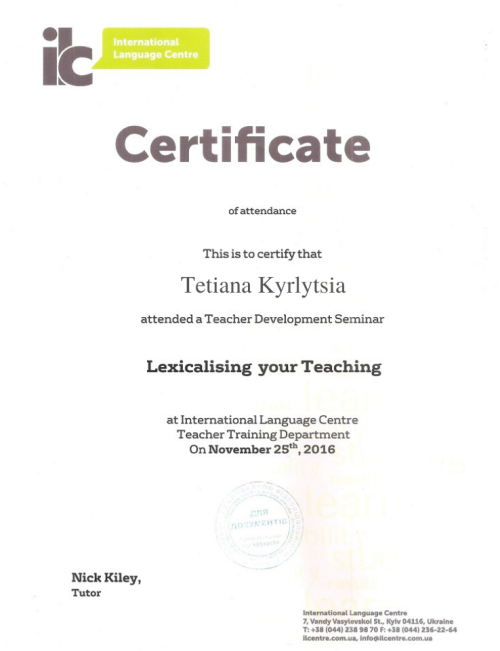 Я постійно поповнюю власну бібліотеку навчальних матеріалів: класичні підручники, інтерактивні ресурси, авторські розробки відповідно до міжнародних стандартів. Заняття завжди включають відео, аудіо, тексти з вправами на лексику, граматику, вимову, а також цікаві теми для дискусій.